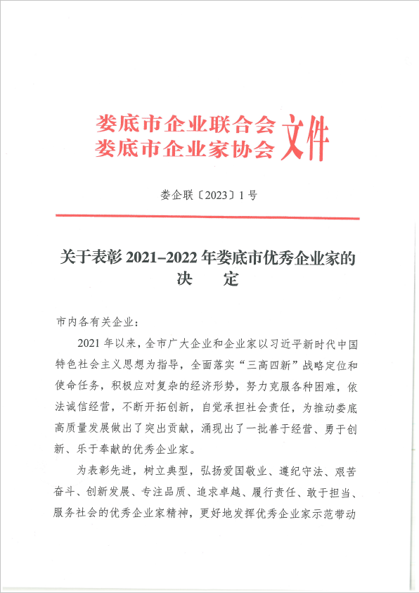 關(guān)于表彰2021-2022年婁底市優(yōu)秀企業(yè)家的決定