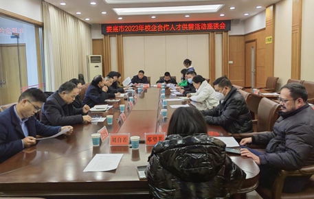為貫徹落實湖南省“三高四新”發(fā)展戰(zhàn)略,全面推動婁底中部地區(qū)“材料谷”建設(shè),助力婁底中小企業(yè)紓困增效,助力人才集聚,促進(jìn)經(jīng)濟(jì)發(fā)展。2023年2月13日下午,“婁底市 2023 年校企合作人才供需活動座談會”在婁底市企業(yè)聯(lián)合會、企業(yè)家協(xié)會召開。婁底市人民政府原副市長、市企業(yè)聯(lián)合會、企業(yè)家協(xié)會會長余明庭出席并講話,市工信局二級調(diào)研員潘曉燕、市人才發(fā)展服務(wù)中心主任劉偦、湖南人文科技學(xué)院、婁底職業(yè)技術(shù)學(xué)院、婁底瀟湘職業(yè)學(xué)院等院校招生就業(yè)處負(fù)責(zé)人以及各縣市區(qū)企業(yè)家協(xié)會負(fù)責(zé)人參加此次座談會。